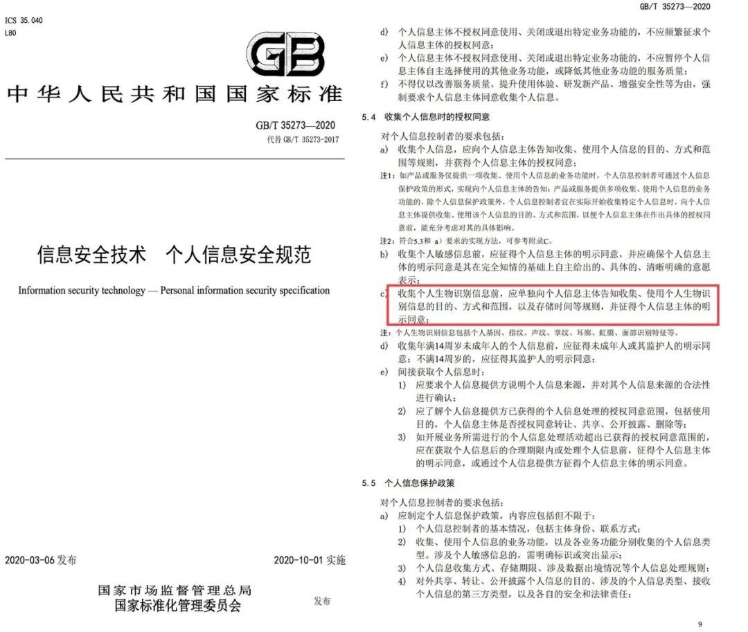 2020年10月1日正式實施的《信息安全技術個人信息安全規範》中規定,收集個人生物識別信息前,應單獨向個人信息主體告知收集、使用個人生物識別信息的目的、方式和範圍以及存儲時間等規則,並徵得個人信息主體的明示同意。