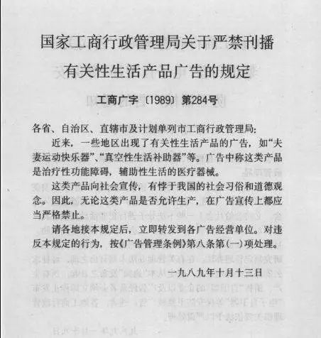 “一些地區出現了有關性生活產品的廣告……這類產品向社會宣傳,有悖於我國的社會習俗和道德觀念。因此,無論這類產品是否允許生產,在廣告宣傳上都應當嚴格禁止。”