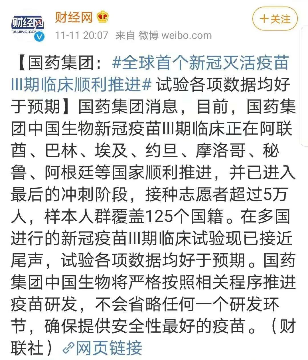 11月11日,在輝瑞發佈驚人消息的第2天,國藥集團按捺不住心中的激動,沒有再通過董事長個人,而是以集團名義發佈第Ⅲ期臨牀試驗的消息。