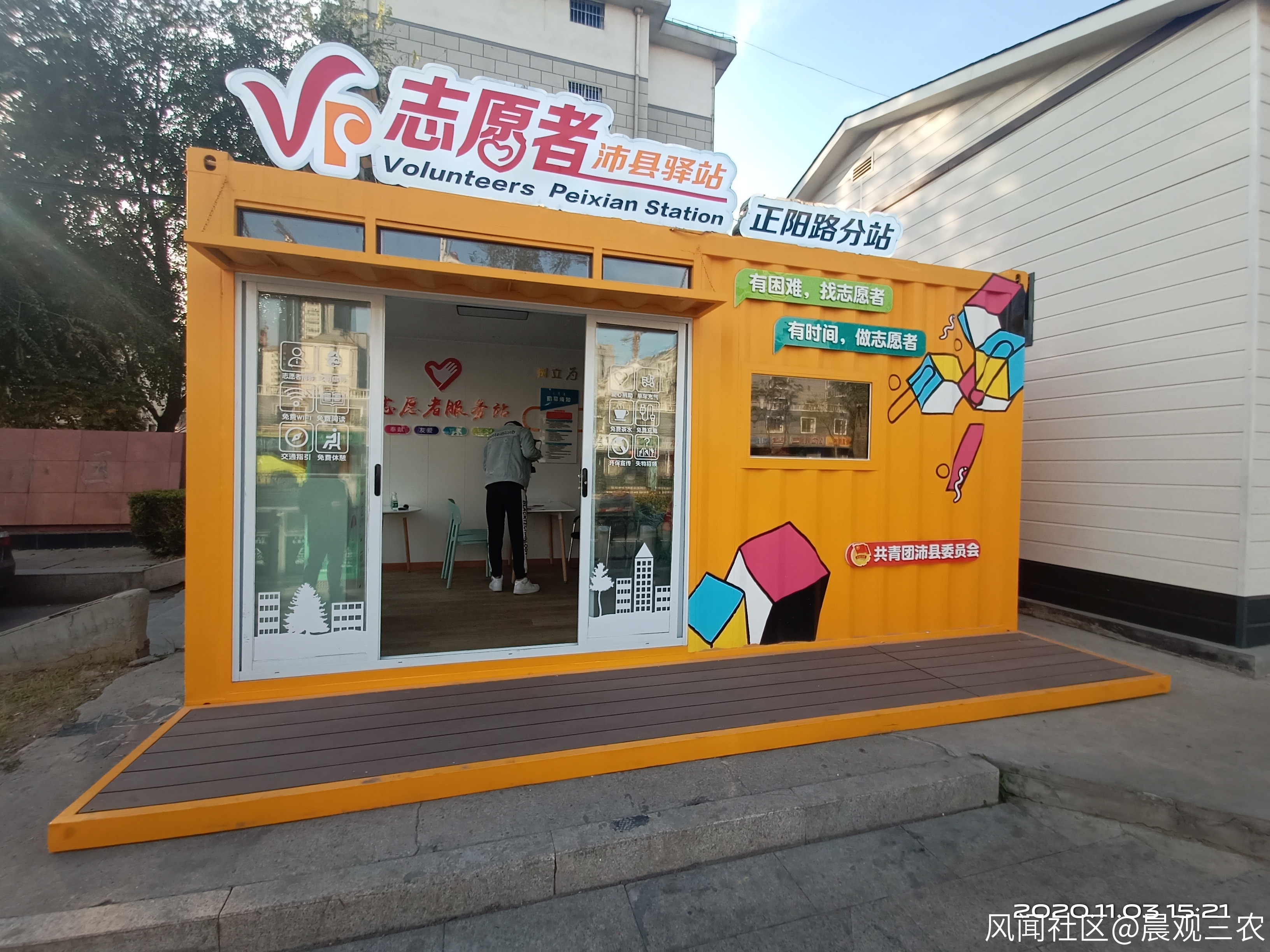 在正陽路鼓樓小區東門外,有一間黃色的小房子,醒目的橘黃色,“有困難找志願者,有時間做志願者”幾個字讓人悦目,落地式玻璃窗上“免費茶水、免費打氣、免費充電、提供雨傘、輪椅應急服務”等十幾項服務項目,圖文並茂,一目瞭然。