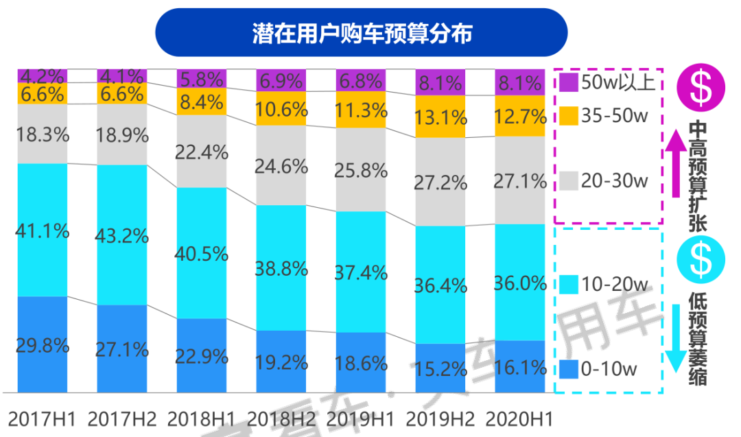 汽車之家大數據顯示,在潛在購車用户中,購車預算在20萬以上用户比例持續提升。從2017年上半年到2020年上半年,這一數據增長了18.7%,而10萬以下預算的用户比例下降了13.7%。