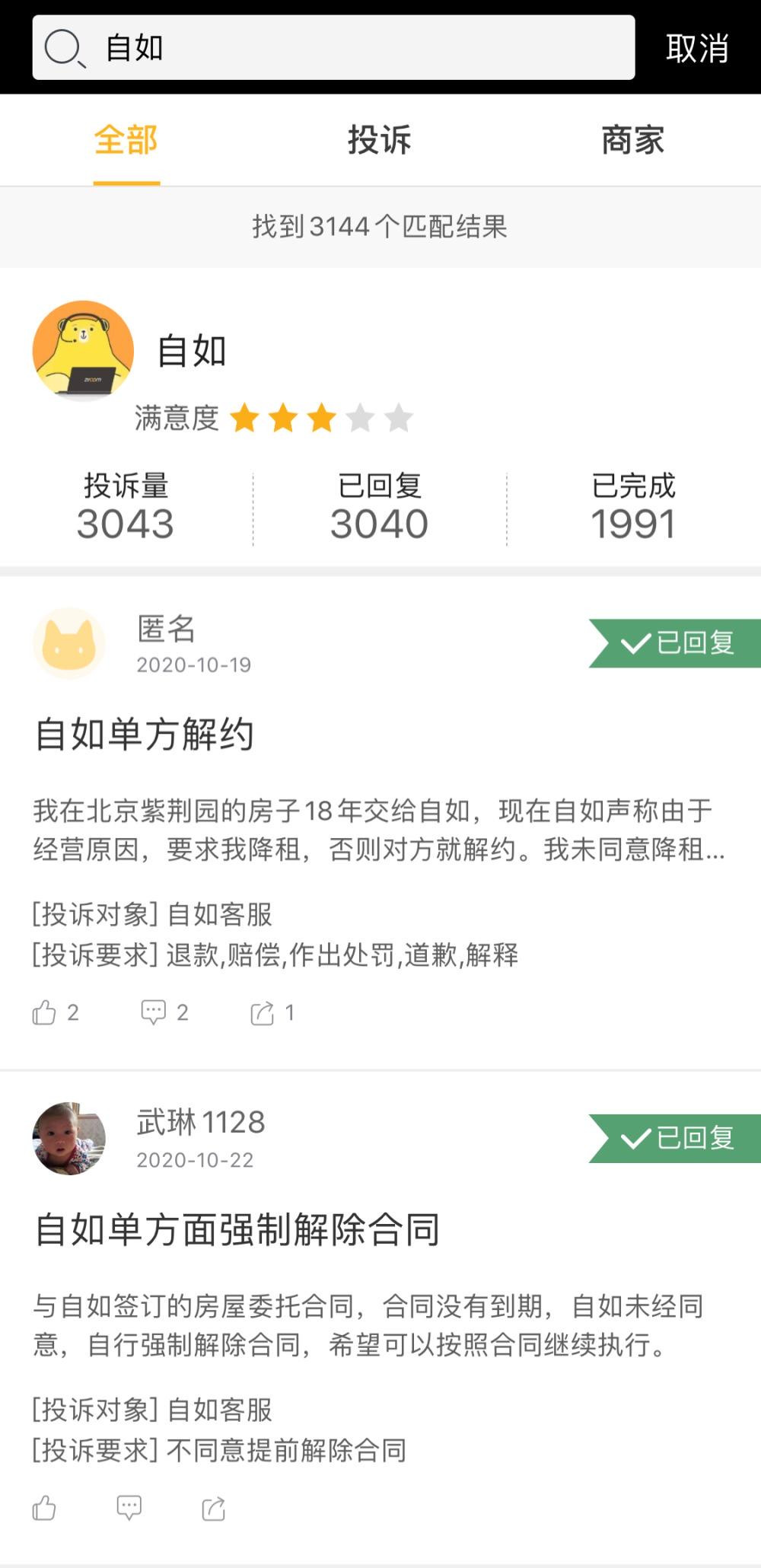 而據第三方投訴平台顯示,不少投訴者表示自己作為房東被自如要求降租或者單方面解約。此前媒體也報道過,廣州、深圳等城市的租客和業主收到平台解約的消息,北京業主被自如要求降租。