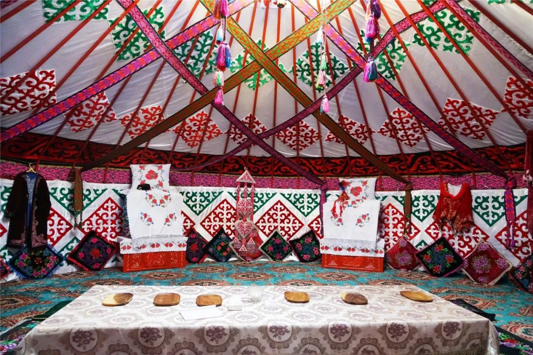 屋子裏視線所及之處都被五顏六色的刺繡品佈置得精美又温馨,展現出哈薩克族人民對於美好生活的熱愛與追求。