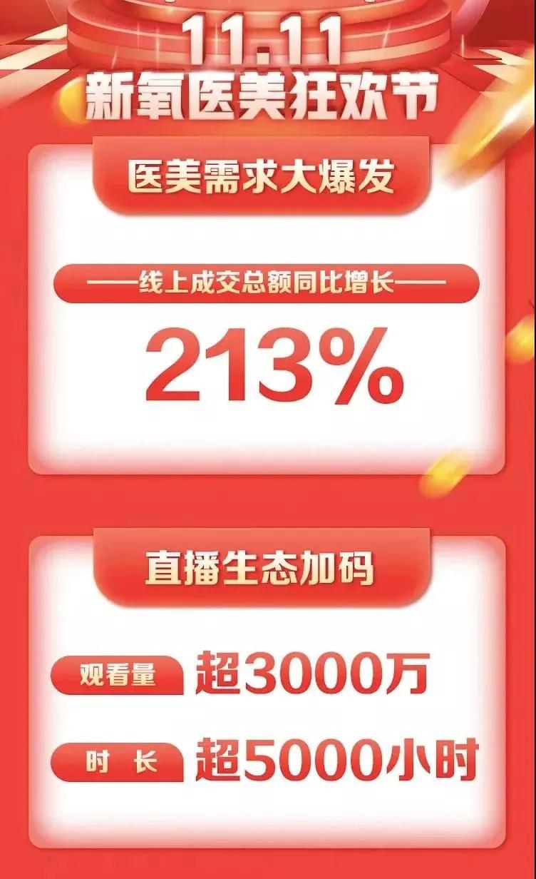 互聯網醫美行業第一股新氧,更是交出了靚麗的戰報。10月14日0時至11月11日24時,新氧“11.11醫美狂歡節”期間,線上成交總額同比增長達213%。