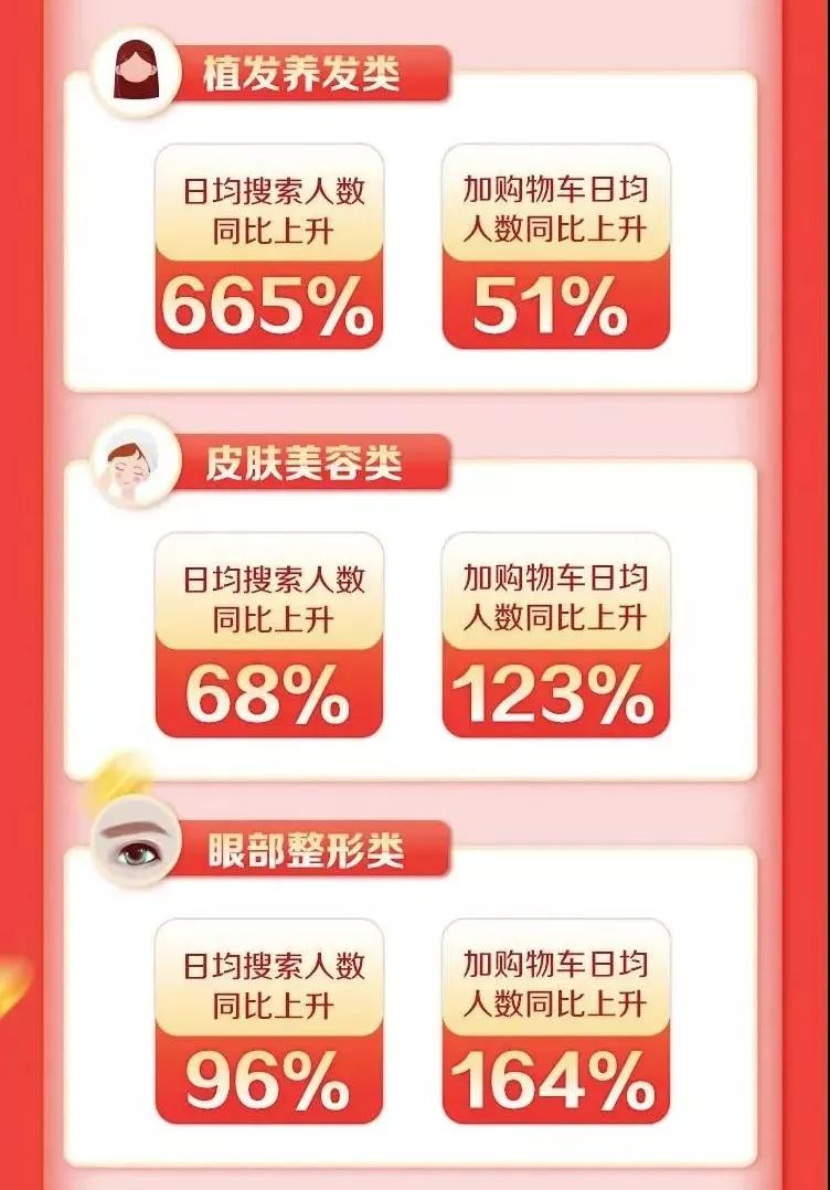 據統計,皮膚美容類項目日均搜索人數同比上升68%,加購物車日均人數同比上升123%。
