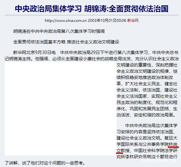 2003年9月,第十六屆中央政治局第八次集體學習,林尚立以復旦大學國際關係與公共事務學院教授身份進行講解,主題是《堅持依法治國、建設社會主義政治文明》。