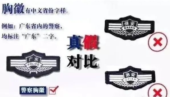 另外胸徽也需要特別注意,警察真正的胸徽上面寫有中文省份字樣,比如説山東省內的警察就會在胸徽上標註“山東”二字。如果出現標註“治安”“保安”之類字樣的,基本就是假警察了。