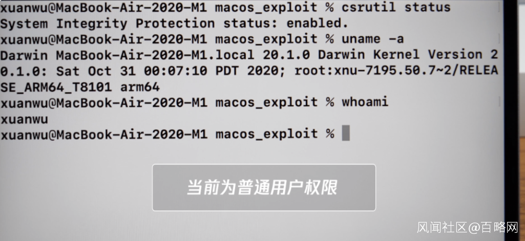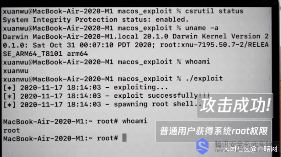 據報道,一台搭載蘋果自研M1芯片的MacBook Air,在升級到最新系統並且正常開啓MacOS系統保護的情況下,不需要密碼,只需要一個腳本就可以提權攻擊成功,攻擊者可取得系統最高權限root身份!