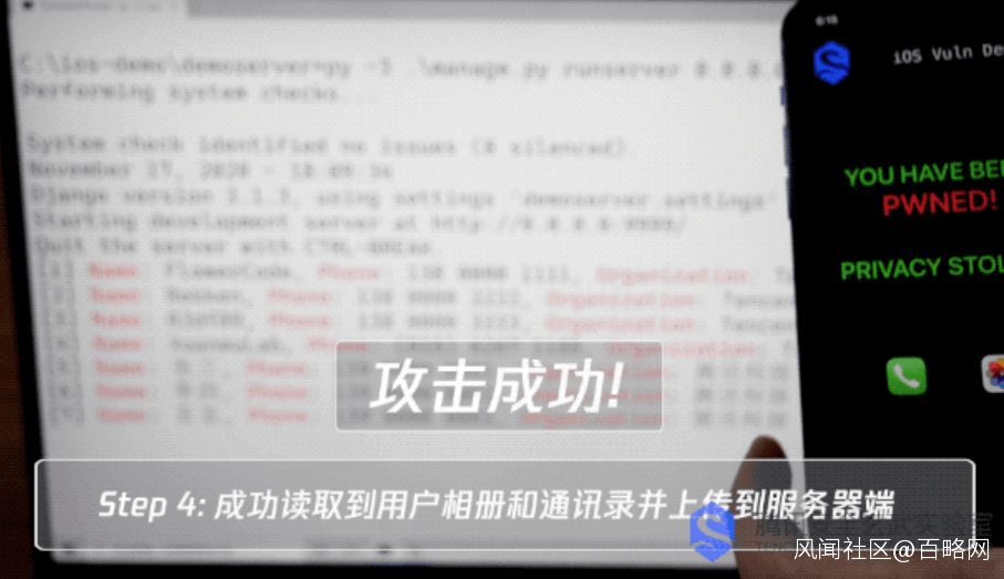 但是當測試者發起進攻後,可以看到蘋果的系統雖然説了“不”,但是該攻擊App仍然讀取到了相冊和通訊錄,並上傳到了攻擊者的服務器端。