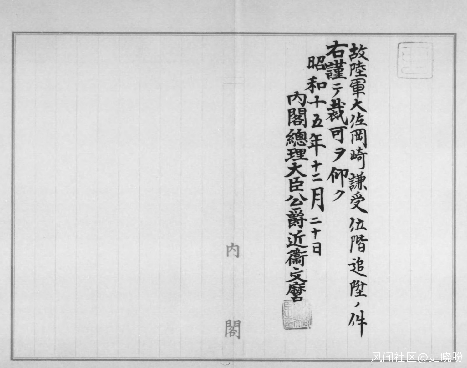岡崎追授的日方文件照片。值得注意的是,岡崎戰死的時候軍銜是中佐,追授按照慣例漲了一級到大佐。