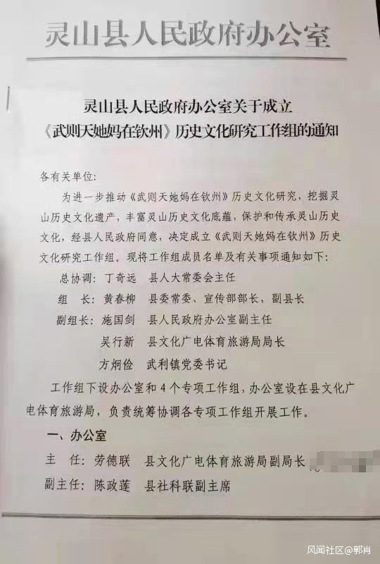 據澎湃新聞報道,19日,記者注意到,在微信朋友圈、新浪微博等多個網絡平台上流傳一張廣西靈山縣人民政府辦公室紅頭文件。文件標題為《靈山縣人民政府辦公室關於成立<武則天她媽在欽州>歷史文化研究工作組的通知》。