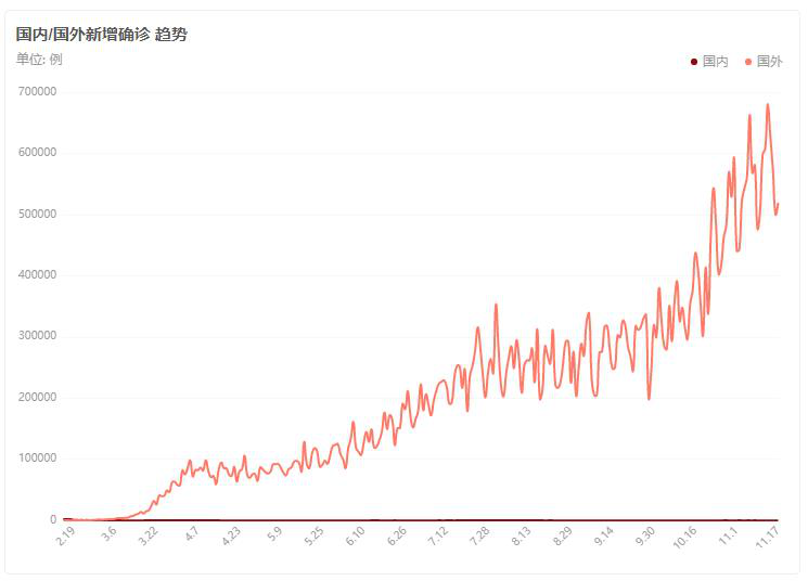 截至11月18日,國外已累計確診56022300例,累計死亡1341956例。