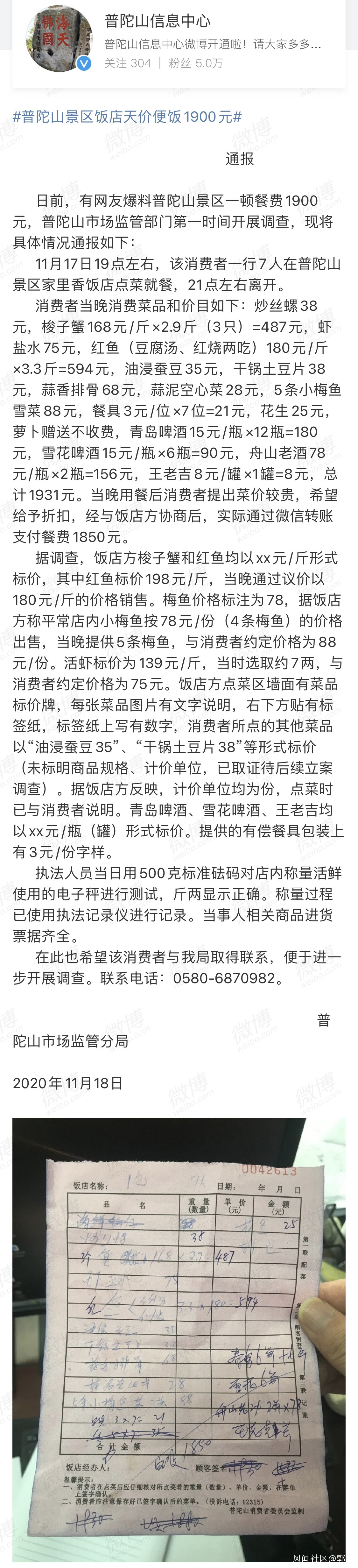 昨晚,@普陀山信息中心 發佈針對此事的情況通報,公開了爆料遊客當晚的菜單及菜品價格: