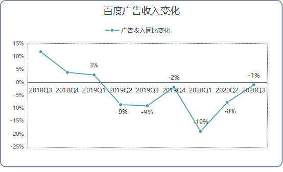 從2019年Q2開始算起,這已經是百度廣告收入連續負增長的第六個季度。不過也可以明顯看到,這個下降幅度相比去年和今年上半年已經大為收窄。