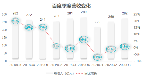 兩年來,百度的季度營收一直處於原地踏步。2020年Q3,百度營收282億元,同比增長0.5個百分點,與2018年Q3並列為“百度史上最賺錢第三季”。但是0.5%的同比增長率,確實有些不太夠。