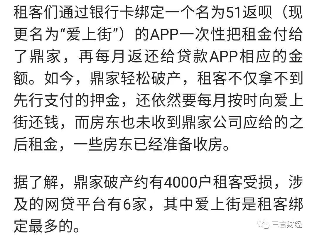 據《中國房地產報》報道,鼎家破產約有4000户租客受損,涉及網貸平台有6家,其中“愛上街”是租客綁定最多的。