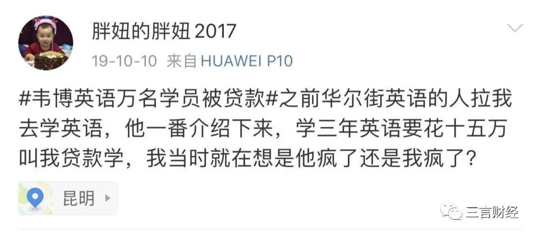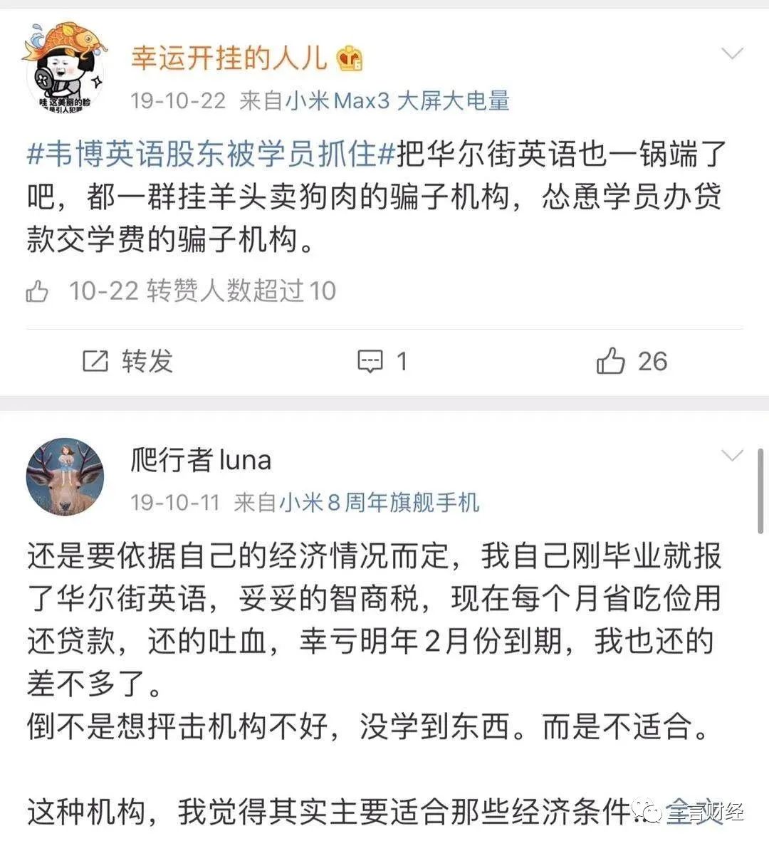 也有大批網友在社交平台中爆料稱華爾街英語誇大課程質量,並且如果學員無力支付高昂學費,還會誘導學員貸款學習。