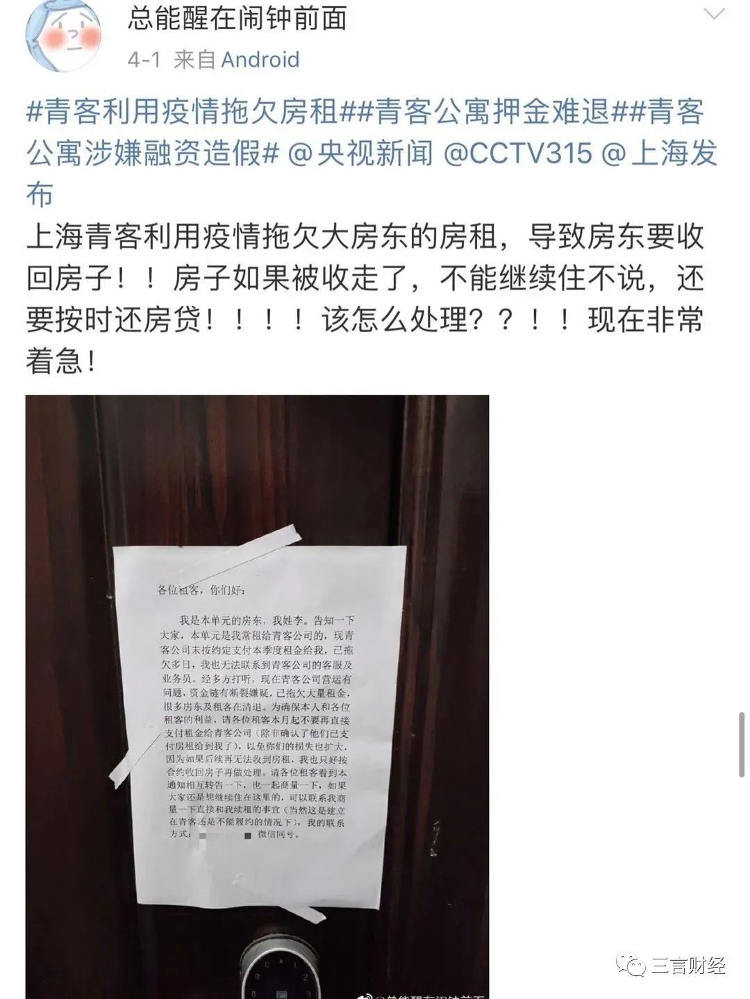 今年年初,有大量青客公寓房東、租客表示青客公寓拖欠房租、無法退還押金。