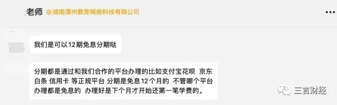 三言財經調查的譚州教育案例中,對方就聲稱課程貸款服務提供方來自京東白條、支付寶花唄等平台。