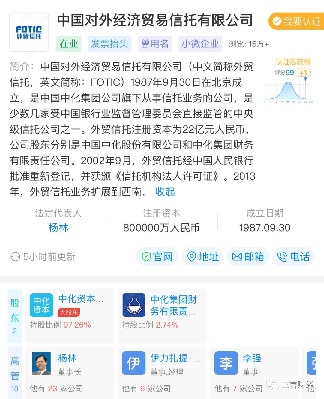 天眼查顯示,該公司於1987年成立,是中國中化集團公司旗下從事信託業務的公司。該公司大股東為中化資本,持股97.26%。
