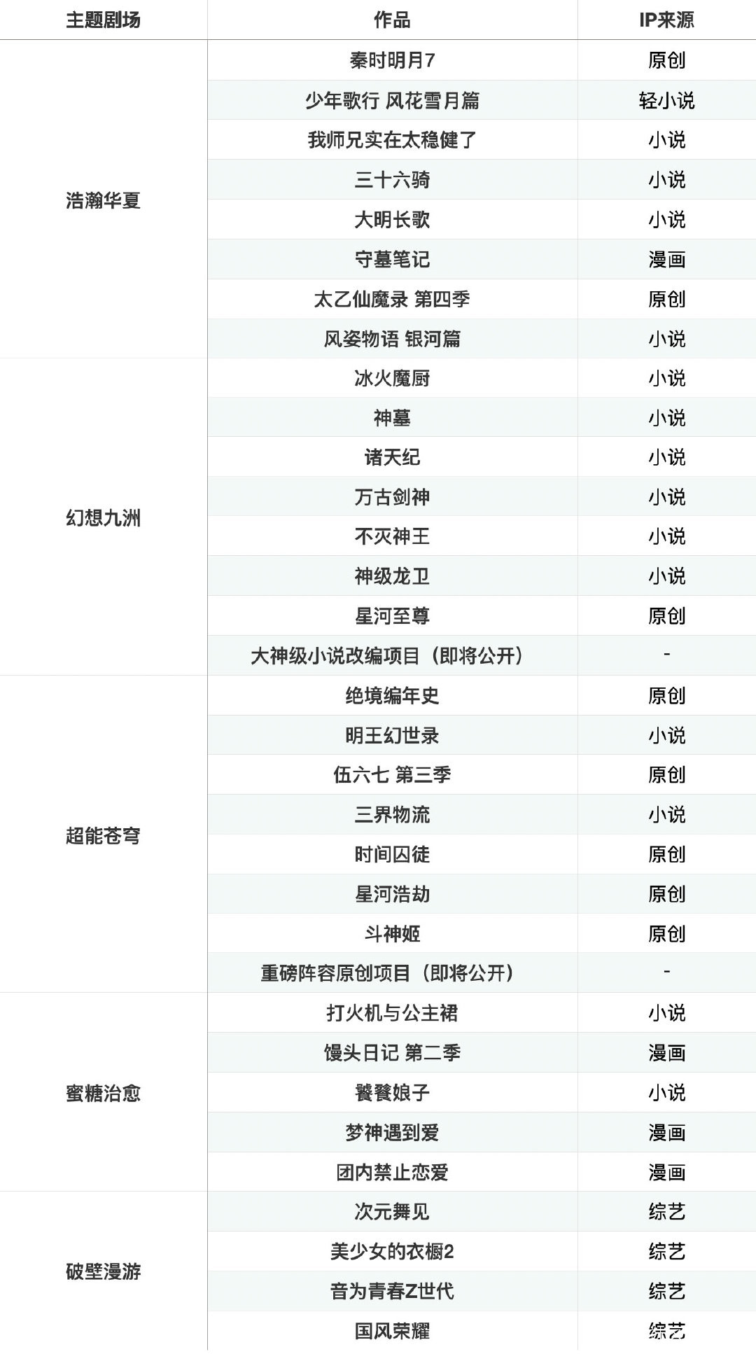 該片單以“浩瀚華夏”、“幻想九州”、“超能蒼穹”、“蜜糖治癒”、“破壁漫遊”這5大主題劇場來分類,涵蓋了30餘部優質的國漫IP。無論是從作品的數量還是質量上看,該片單在當前佈局國漫市場的視頻平台中,已經是相當的豐富和優質。