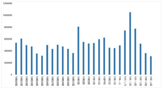 在10月20日至11月15日共計27天監測期內,系統共收集“雙11”相關“消費維權”類信息14296274條,日均信息量約53萬條。監測期間,“消費維權”信息曲線呈波動走勢,並在10月21日、11月1日和11日出現三個輿情聲量高點,高點出現與多家頭部電商平台的開幕“狂歡”和兩波促銷密切相關。其中,峯值出現在11月11日,為1051437條。