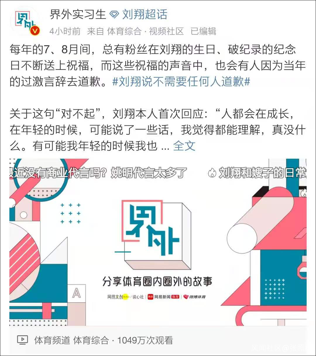 11月20日,網易體育頻道與微博博主@談心社社長 合作的《界外》欄目@界外實習生 發佈了一期關於劉翔的訪談。
