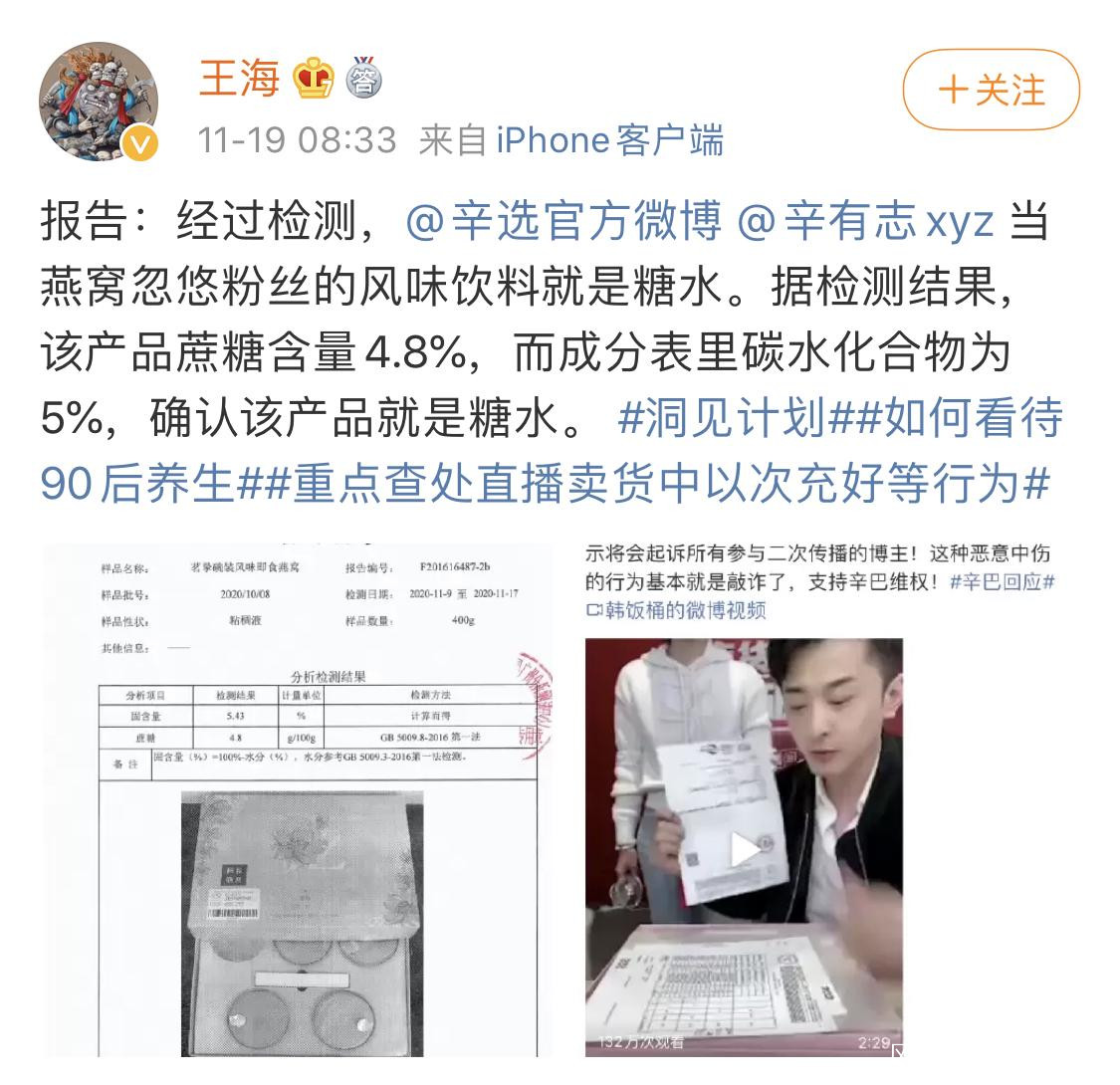 11月19日,一條“辛巴所售燕窩被王海檢測為糖水”的話題登上熱搜,引起熱議。王海在社交軟件表示經檢測,辛巴所賣燕窩就是糖水,並曬出有關檢測報告。