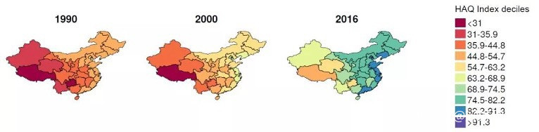 1990年到2016年,我國大陸地區的HAQ圖譜完成了從暖色到冷色的蜕變。截止2016年,大陸地區的HAQ指數得分為78分,在195個國家中排名第48位。同時,東部沿海地區多個城市的得分達到82分以上,排名位於世界前列。這背後,不僅僅是我國醫療水平的進步和醫療資源的豐富,還有醫保惠及全民帶來的醫療可及性的提升。而在疫情這類公共衞生危機期,醫療可及性的提升可能才是降低死亡的關鍵。