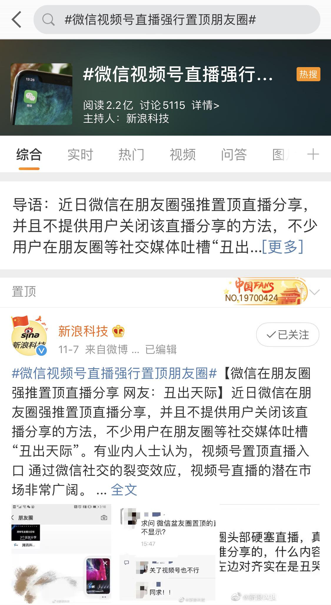 微信視頻號今年1月19日上線,承載着微信生態的連接作用。微信為了推自家視頻號動作頻頻,想方設法瘋狂刷存在感,前段時間,視頻號上線“直播”和“預約直播”的功能,直接在朋友圈強行置頂視頻號的直播分享功能,而且沒有任何關閉的按鈕,一旦有朋友分享了直播功能,用户只能被迫觀看,相關話題一度登上熱搜,這個功能遭到了用户強烈反對。