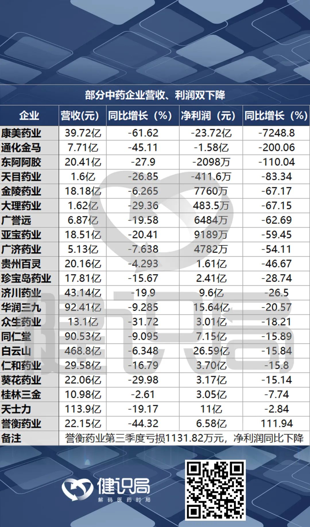 2020年各家三季度報顯示,今年1-9月,中藥企業未能挽回頹勢。據健識局不完全統計,至少21家中藥企業營收、利潤率同比下滑。如康美藥業、東阿阿膠、通化金馬、天目藥業已經出現大規模虧損,且利潤降幅超過100%。