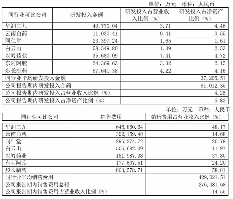 另據天士力2019年年報中提供的一份同行業可比企業數據。**雲南白藥、同仁堂、以嶺藥業、白雲山等知名藥企,對研發的投入也都不高。特別是雲南白藥,只拿出了總營收的0.41%用於研發。**遠不及銷售投入。