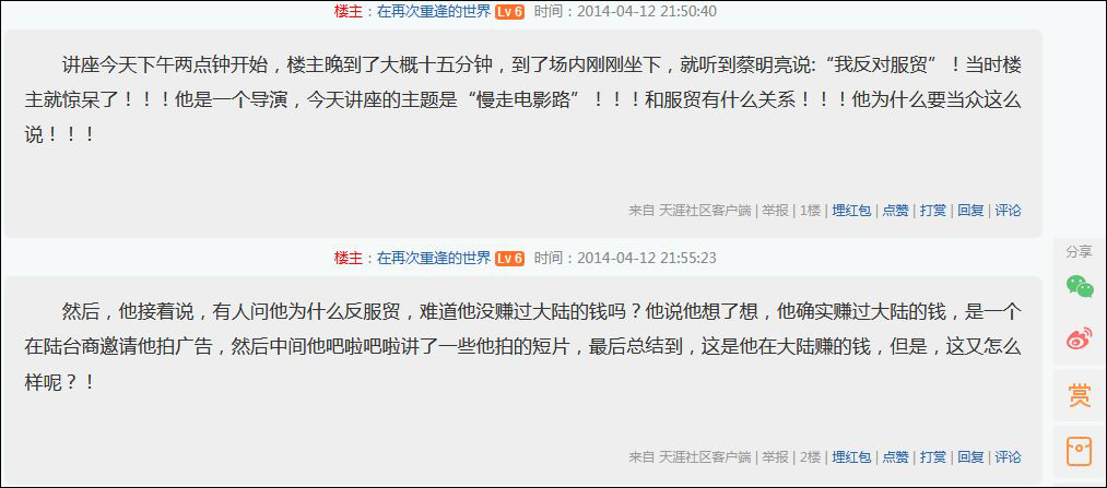 有網友表達了對“抵制蔡明亮”的不滿,稱:“藝術和立場是兩碼事”。