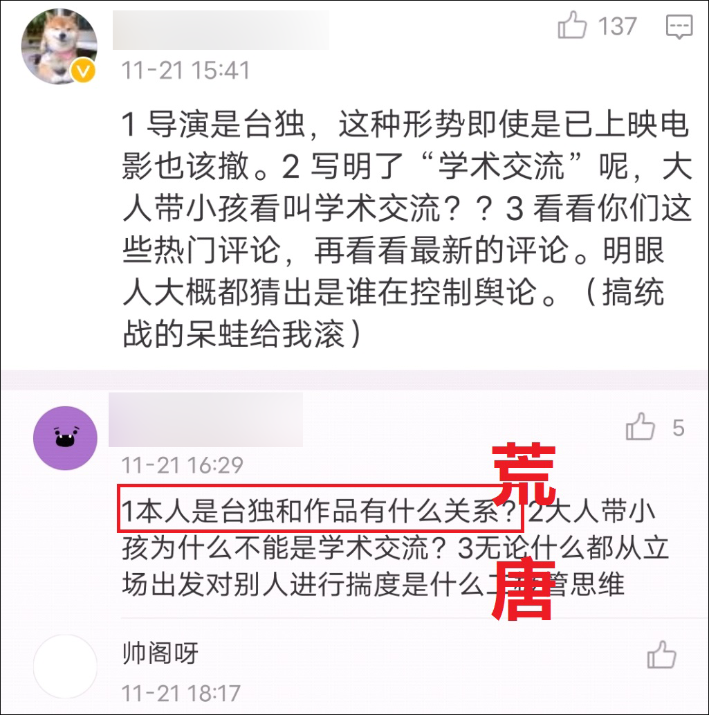 這引發了網友之間的進一步爭吵,甚至有人追問:“導演本人是‘台獨’和作品有什麼關係?”