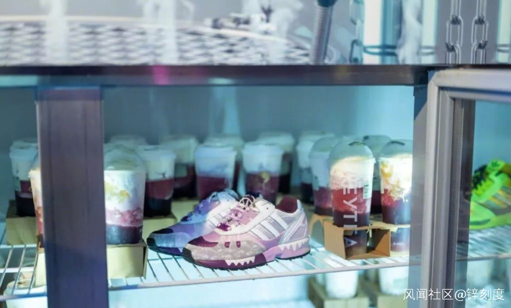 最近的翻車案例則是,聯名喜好者喜茶與阿迪達斯的聯名營銷——雙方合作推出了一款名為“多肉葡萄紫跑鞋”的運動鞋,按照官方説法,這次合作“是一次對千禧年專屬特色Y2K潮流文化的融合,是一個跨世紀時期對高科技的幻想”。產品展示架上,一杯杯多肉葡萄紫飲料,與阿迪達斯運動鞋擺放到了一起。