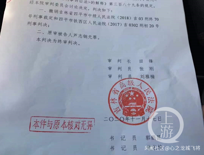11月20日,吉林省高級人民法院來到吉林長春興業監獄向蘆志鋼下達判決,撤銷四平市中院刑事裁定、四平市鐵西區人民法院刑事判決,蘆志鋼被無罪釋放。至此,蘆志鋼已被羈押了3年之久。