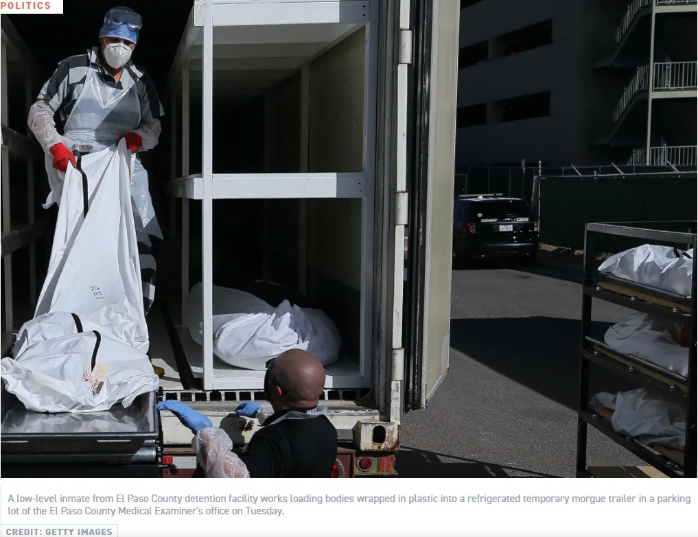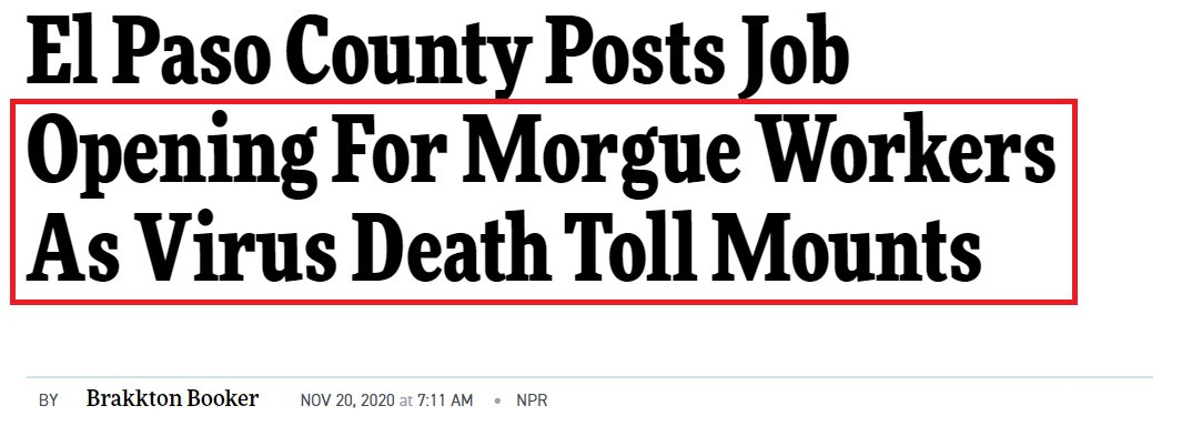 德克薩斯州邊境縣埃爾帕索(El Paso)自10月以來已有300多人死於COVID-19,該州正在為能夠抬起重達175磅(79公斤)或更多的屍體的停屍房工人提供招聘廣告。官員們提供的時薪超過27美元,這不僅是體力勞動,而且是“情感上的負擔”。