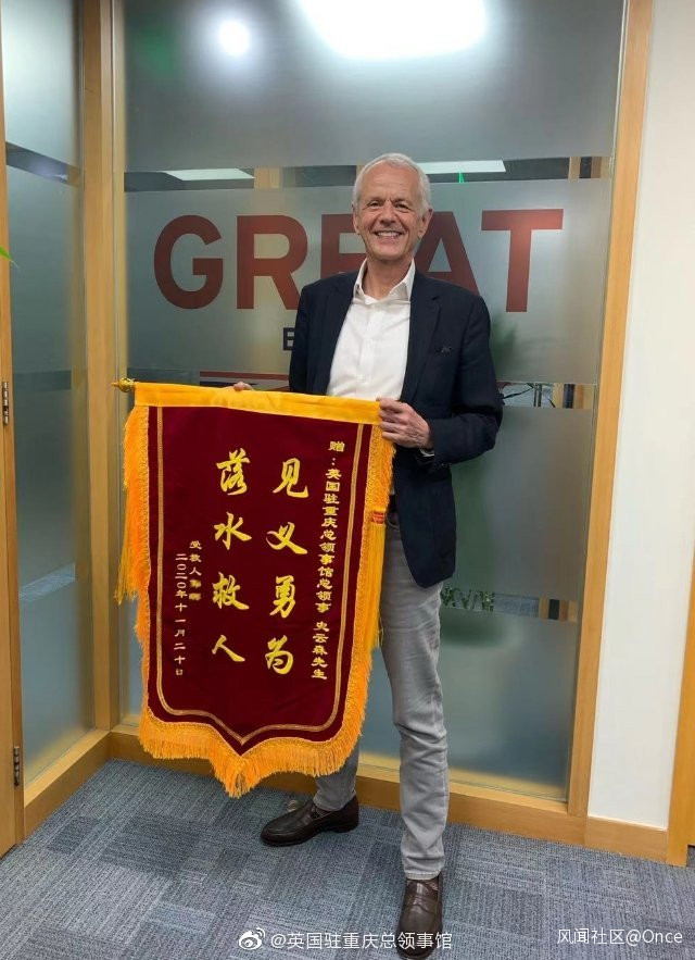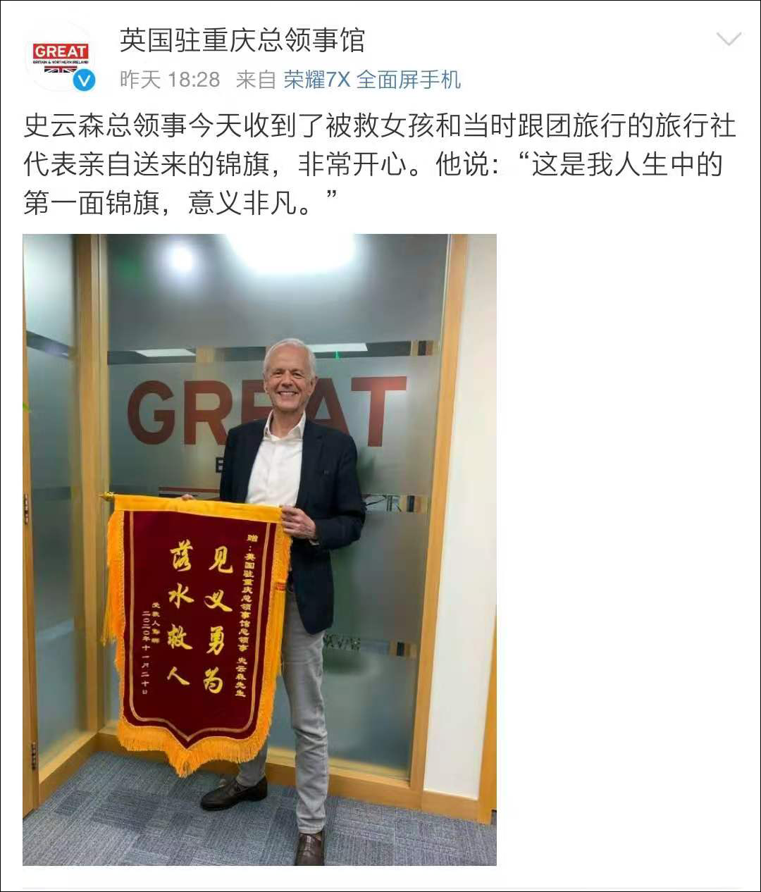 據@英國駐重慶總領事館 11月20日晚消息,此前見義勇為,跳水救人的領事館總領事史雲森先生,收到了被救女孩和當時跟團旅行的旅行社代表親自送來的錦旗。