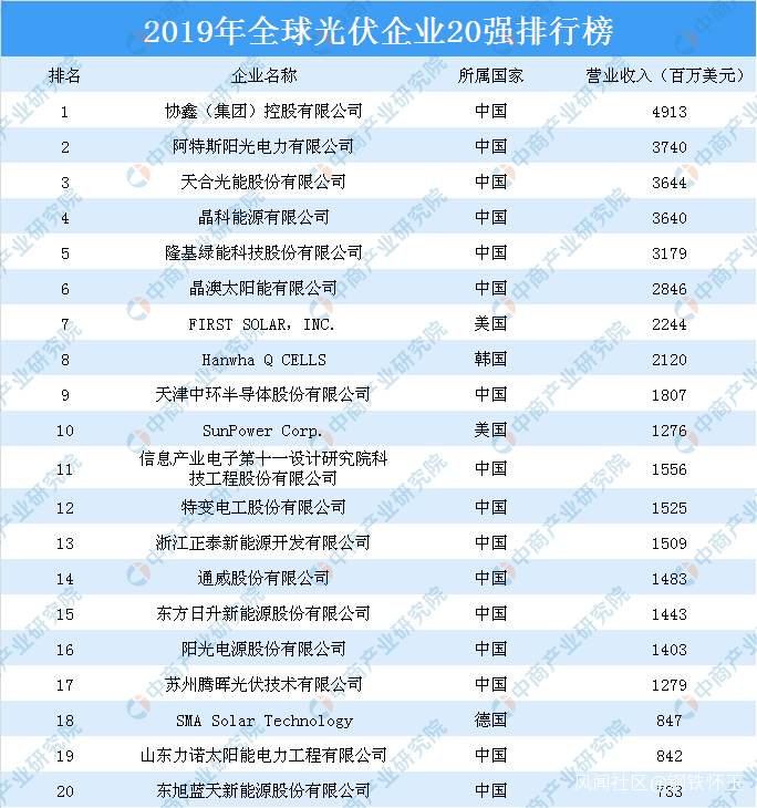 查了一下資料,作者所説的全球太陽能公司排名,大概就是下面這個“2019全球光伏企業20強排行榜”:
