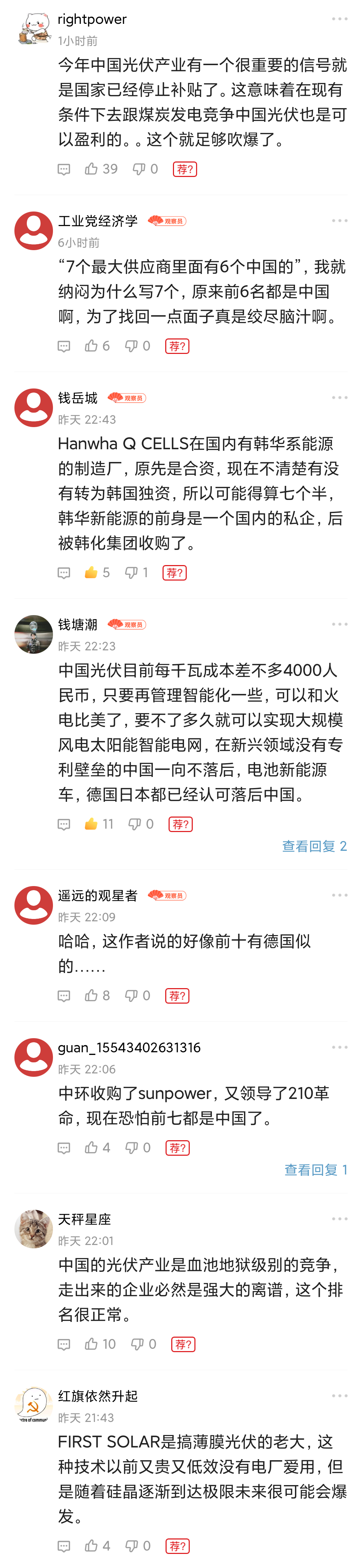 “家裏的屋頂上馬上就要安裝一個太陽能。我不介意安裝時間長些。我跟安裝人員説,請不要使用任何中國的太陽能部件,而是用德國產的。但安裝工笑了。直到我看到全球太陽能公司的排名後,我終於知道他笑的原因了:7個最大的供應商中有6個是中國的。”