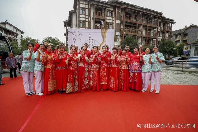 △在重慶南川金佛山中醫院,貧困腫瘤康復患者在中式集體婚禮儀式結束後和醫護人員合影(7月30日攝)。新華社記者 黃偉 攝