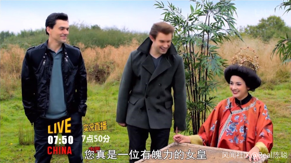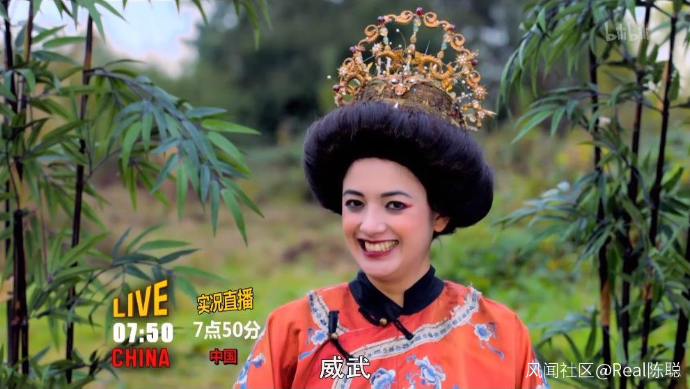 隨後,畫面左下方出現了“China”的字樣,一位白人女性打扮成旁白中提到的女皇武則天出鏡。