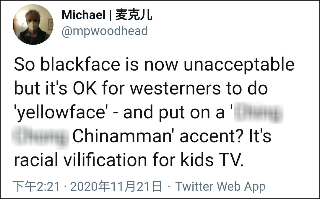 但是也有網民表示,“現在扮‘黑臉’已經是不能夠被民眾接受了,那麼西方人扮‘黃臉’,然後操一口‘中國人’的口音講話,就是可以的嗎?這檔兒童節目就是赤裸裸的種族歧視。”