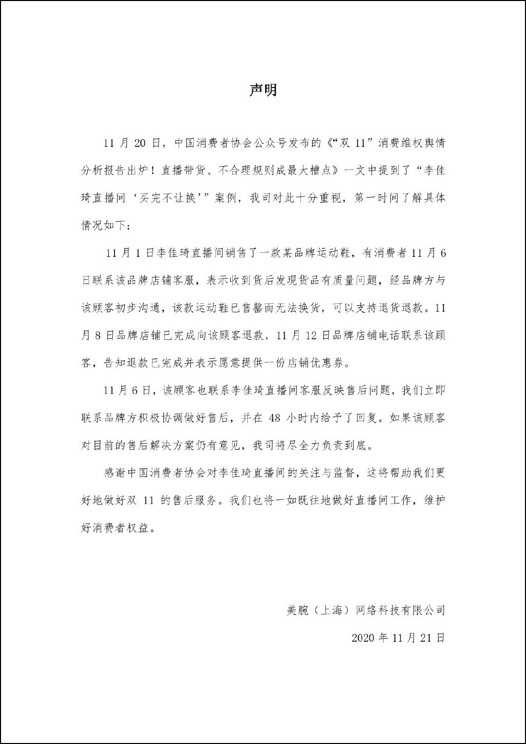 對此,李佳琦方於11月21日晚作出回應,稱消費者之所以無法更換源於品牌方的貨物售罄,後續已進行退款處理。李雪琴工作室同日發表的聲明也稱,李雪琴只是作為嘉賓參與直播,不參與實際運營,對於數據問題也不知情。