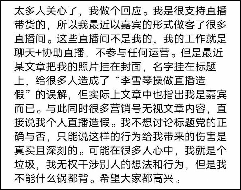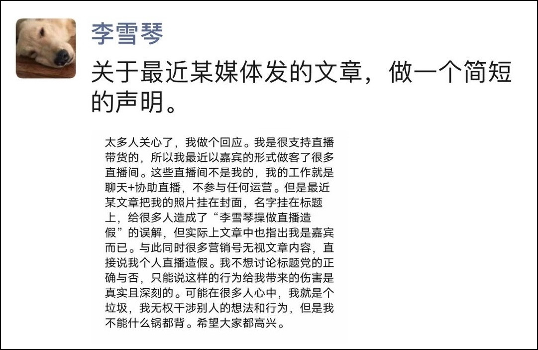 李雪琴本人於11月13日在朋友圈中回應,稱自己只是作為嘉賓參與直播,不參與任何運營。