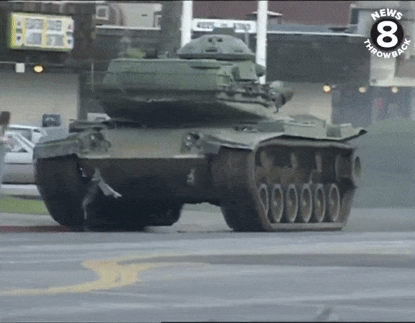 他駕駛坦克衝出軍械庫,以48公里/小時的速度在街道上橫衝直撞,好在坦克裏沒有任何彈藥,無法使用武器。
