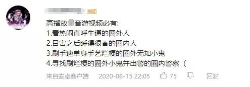 有路人觀眾刷“富婆快樂手”的爛梗,有未去了解嘗試就發送“就這?”、“我上我也行”等輕蔑發言的人,還有部分斥責刷爛梗、站着説話不腰疼亂髮彈幕人士的音遊區原住民,時不時評論區還會夾雜着“純度降低了(悲)”、“音游出圈了(悲)”的感嘆。