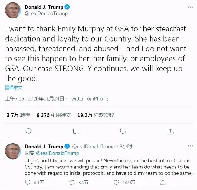 “我要感謝總務署的艾米莉·墨菲,感謝她對我們國家堅定不移的奉獻和忠誠。”特朗普在推特上道出“原委”:“她一直受到騷擾、威脅和虐待——我不希望看到這種情況發生在她、她的家人或總務署的員工身上。”