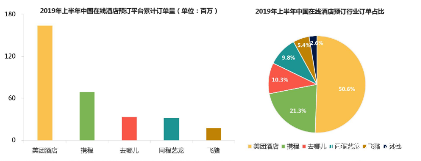 報告顯示,2019年上半年,美團酒店訂單量佔比首次過半,達到50.6%,即“線上訂酒店,一半用美團”。