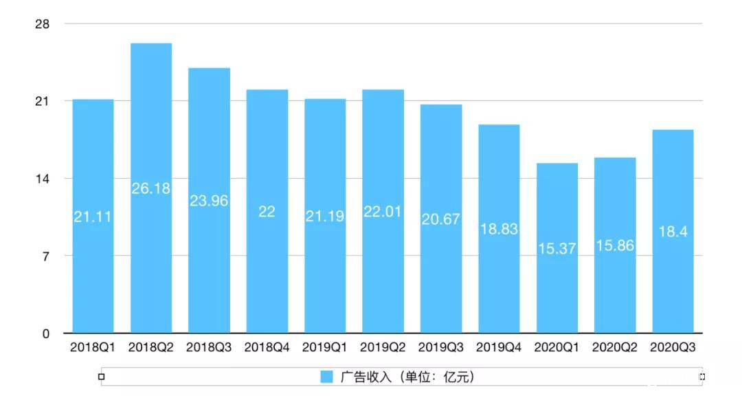 2018Q2是愛奇藝廣告收入的高峯,為26.18億元,此後一路下降,2019Q4跌破20億元,為18.83億元,2020Q1達到最低值,為15.37億元,2020Q3小幅回升至18.4億元,短時間內難以再現輝煌。